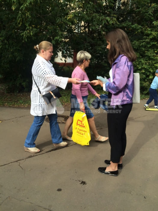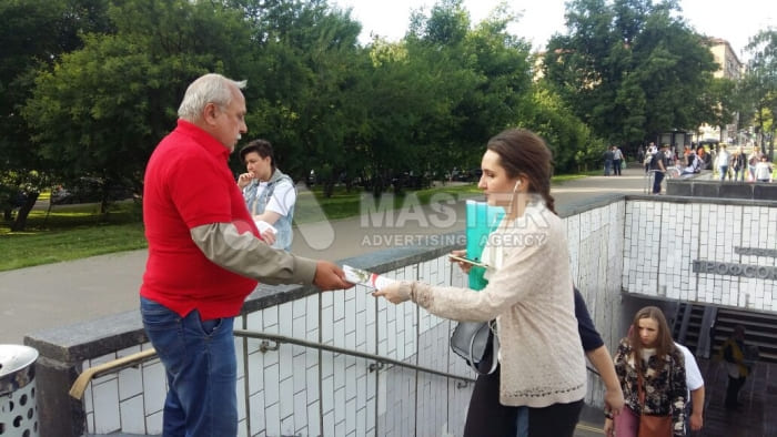 Улица – бесконечный поток ваших потенциальных покупателей и клиентов. Для их привлечения необходимо лишь правильно и своевременно предложить продукцию или услуги. С этой целью мы отправляем обученных промоутеров в точки наибольшего скопления людей. Раздача визиток, флаеров, буклетов осуществляется одетыми по форме, улыбчивыми, корректными, активными юношами и девушками. Они ненавязчиво распространяют полиграфическую продукцию на перекрестках, на выходе из подземных переходов, вблизи остановок и парковых зон. Важной составляющей данного мероприятия является человеческий фактор. Прохожие могут не обратить внимания на огромный, рекламный борд, но с удовольствием возьмут в руки вежливо протянутую листовку.